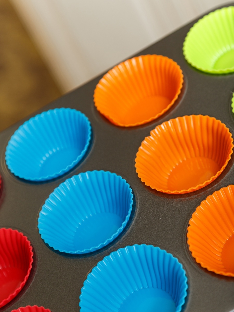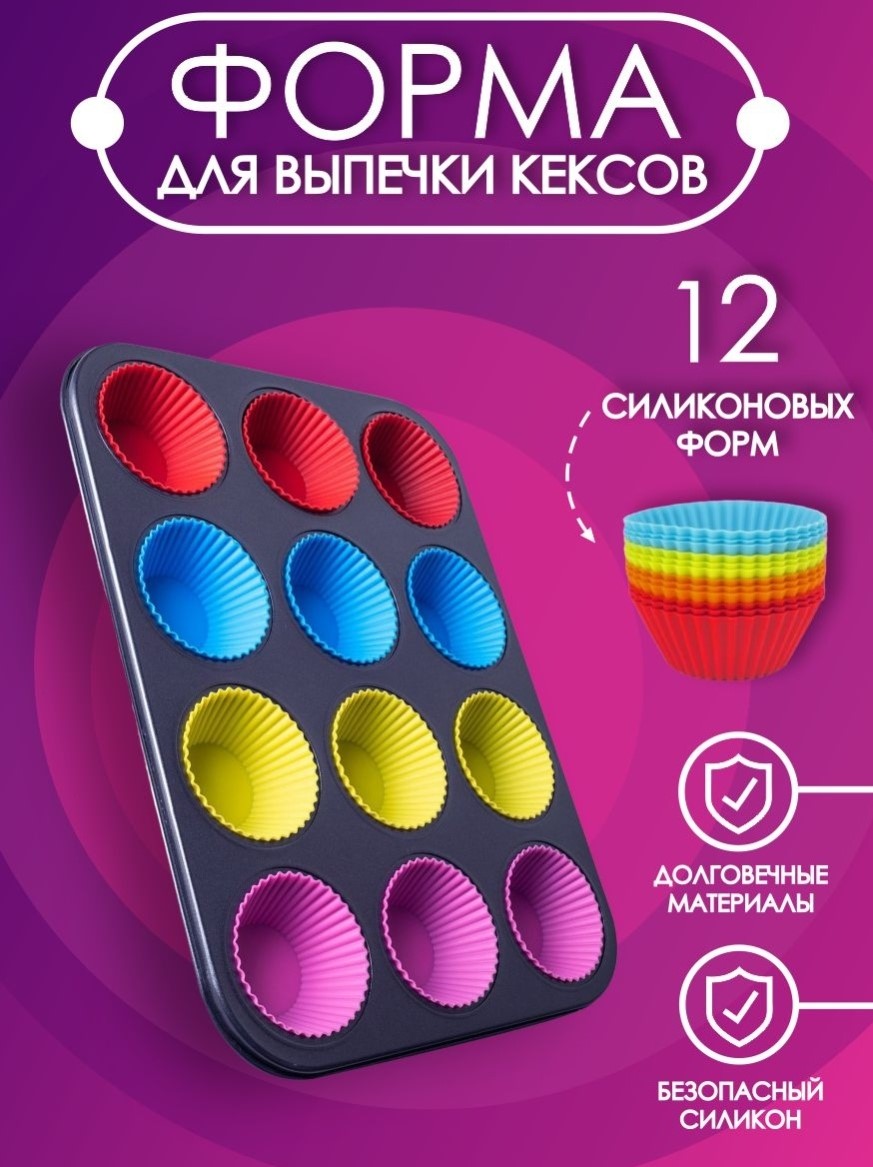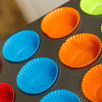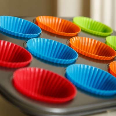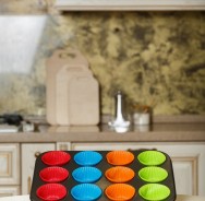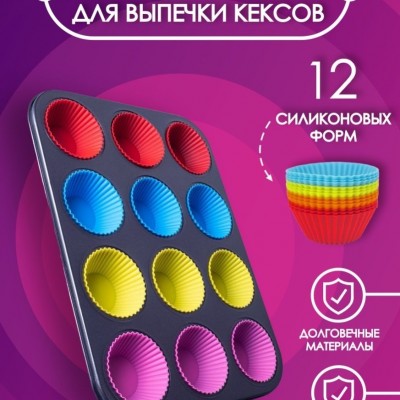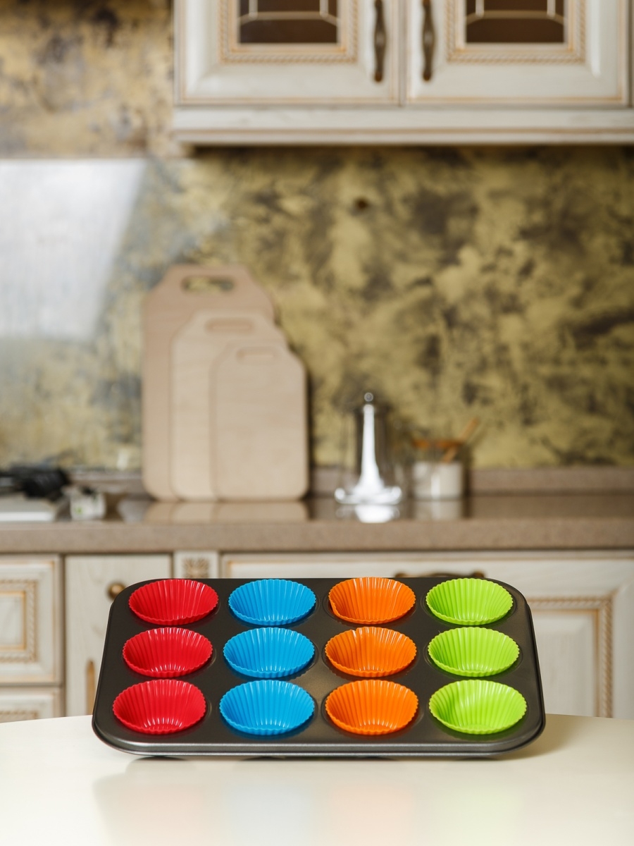 Set tava de copt 12 briose si 12 forme din silicon, 35 x 26 cm